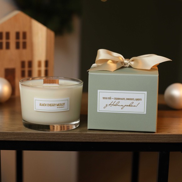 Новорічна соєва свічка з особливим написом. BlACK CHERRY MERLOT (Мерло чорної вишні). ТM TEPLO всередині