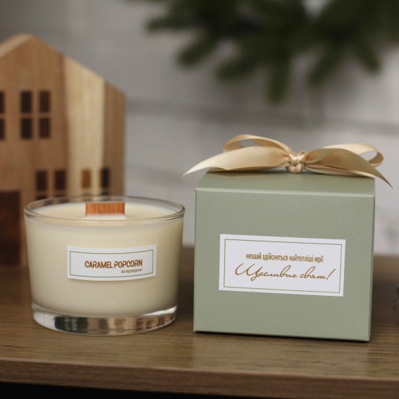 Новорічна соєва свічка з особливим написом. CARAMEL POPCORN (Карамельний попкорн). ТМ TEPLO всередині