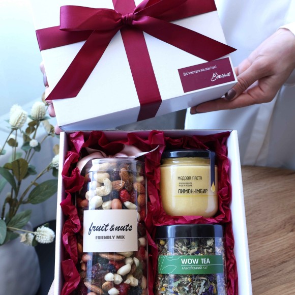 Смачний подарунок PEONY BOX Чайно-медовий №3 з особливим написом на вибір