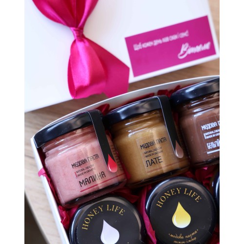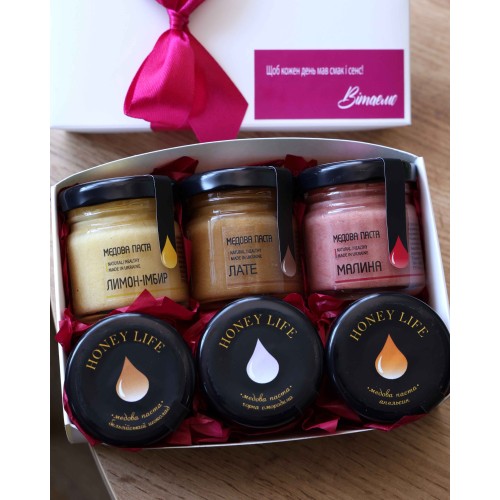 Смачний подарунок PEONY BOX з медовою пастою 6 смаків по 55 г. з особливим написом на вибір