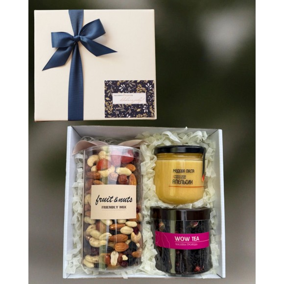 Смачний подарунок до новорічних свят. Чайно-медовий бокс №1 в синьому оформленні