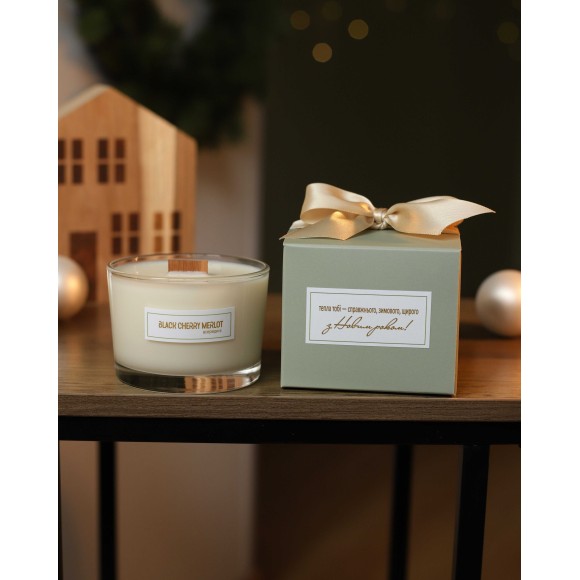 Новорічна соєва свічка з особливим написом. BlACK CHERRY MERLOT (Мерло чорної вишні). ТM TEPLO всередині