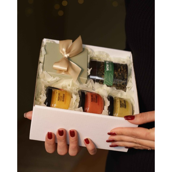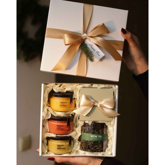 Новорічний подарунок "Теплий бокс" з чаєм. WHITE у синьому оформленні.