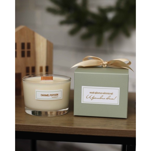 Новорічна соєва свічка з особливим написом. CARAMEL POPCORN. ТМ TEPLO всередині